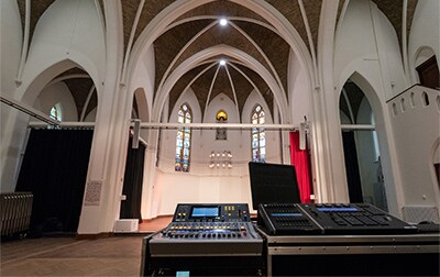 The Kerkzaal is used for presentations and music events, also doubling as a library. Here PX10, PX8 and PX5 power amplifiers and another MTX3, plus ProVisionaire Touch, power and control a system that also features a TF1 mixing console and Tio1608-D i/o unit.