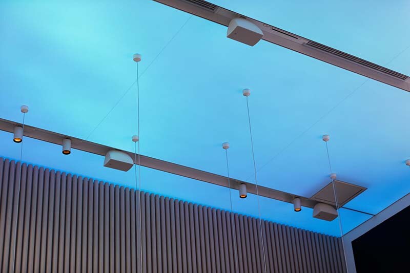 A total of 21 Yamaha VXS5W speakers are installed in the ceiling, assigned to three zones: entrance, a row in front of the video monitor, and the rear area. This allows optimum volume to be set for each zone. The speakers in front of the large monitor deliver sound for video content shown, while the others handle background music. Two VXS10SW subwoofers are also installed in locations that are not visible to guests. Five VXC4W ceiling speakers are installed in the office and restroom.