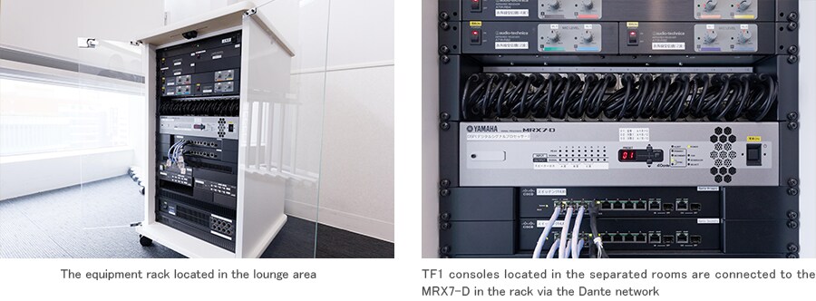There are six UDX conference rooms, and three of those rooms are now equipped with TF1 consoles. All three TF1 consoles are connected to the MRX7-D in the lounge area rack via the Dante network. Three room combination presets have been created to allow instantaneous switchover via the MRX7-D: Room A+B+C is Scene 01, Room A+B with C independent is Scene 02, and all three rooms operating independently is Scene 03. The UDX Gallery setup is similar, with TF1 consoles in the Type S and Type N rooms connected to the MRX7-D via Dante, and preset scenes that allow the audio system to be quickly reconfigured as required.