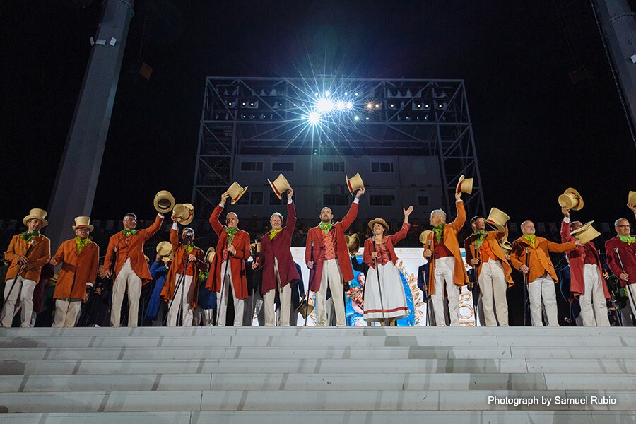 Fiecare spectacol a folosit 40 de oameni la înălțime - voluntari și ingineri de sunet care au susținut suporturile cu microfoane wireless pentru coruri