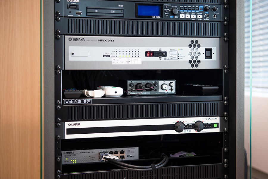 Domnul Takeyama: Nu numai că solicitau un sistem de conferință la distanță, ci și amplificarea unui microfon portabil în timpul întâlnirilor și seminariilor regulate, precum și amplificarea diferitelor surse de intrare, inclusiv a sunetului computerului utilizat în timpul unei prezentări și a sunetului Blu-ray. Datorită acestor solicitări specifice, am ales să adoptăm procesorul de semnal „MRX7-D” deoarece este un sistem flexibil configurat pentru a sprijini astfel de aplicații. În special atunci când amplificați folosind un microfon de mână în timpul unei conferințe web, este aproape imposibil să eliminați complet ecoul, astfel încât funcționalitatea atenuatorului de ecou și a supresorului de feedback încorporat în „MRX7-D” oferă un sistem de mediu confortabil de conferințe web.