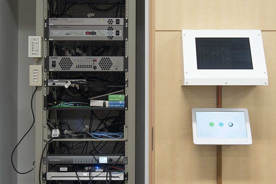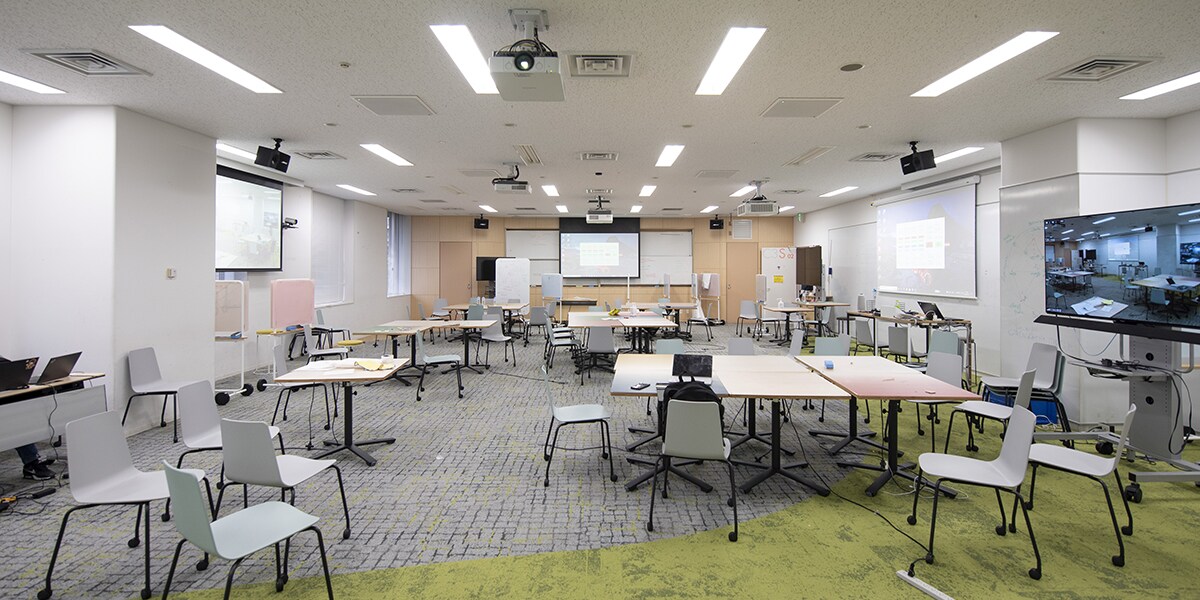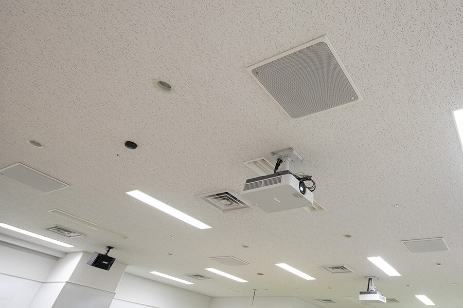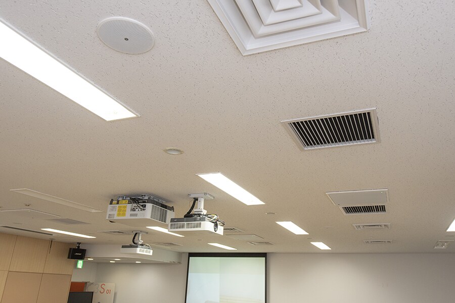 Dna Kitano: Ajungem la numărul de unități necesare nu pornind de la numărul de studenți dintr-o sală de clasă, ci din perspectiva intervalului de captare a vocilor folosind microfoanele din tavan. Deoarece ambele săli de clasă sunt destul de mari și frecvent studenții sunt încurajați să se angajeze în discuții și lucru în echipă, precum și să asculte prelegeri, ne-am gândit că va fi esențial să putem capta sunetul corespunzător din fiecare colț al sălii.