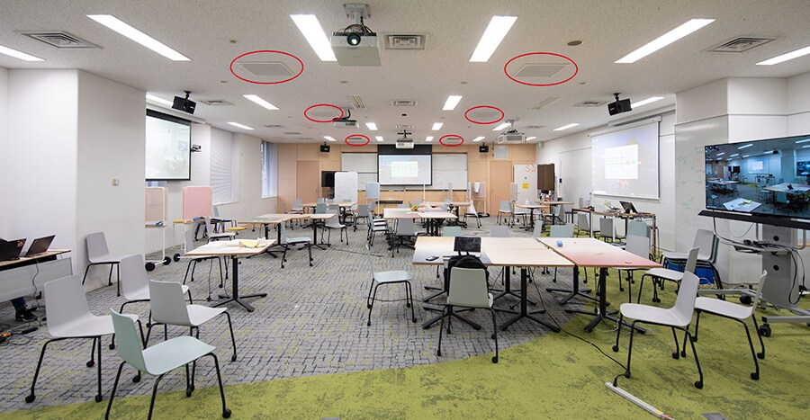 Dr. Sunahara: Sala de clasă mare (C3S02) în care am instalat șase RM-CG-uri putea găzdui până la 100 de persoane înainte de a izbucni pandemia de coronavirus. Astăzi, încercăm să menținem numărul de studenți la aproximativ 40 pentru a menține distanțarea socială în contextul pandemiei de coronavirus. Sala de curs (C3S01) este locul unde am instalat alte patru RM-CG. Înainte de pandemia de coronavirus, această clasă avea 60 de persoane, dar începând cu pandemia de coronavirus, menținem numărul de elevi la aproximativ 30.