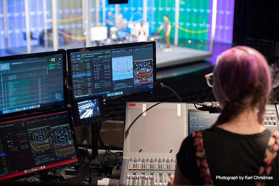 „Am folosit, de asemenea, software-ul de teatru al sistemului pentru diferitele setări necesare pentru studenți, precum și pentru gestionarea dinamicii în diferite secțiuni ale spectacolului”, adaugă Dominic.