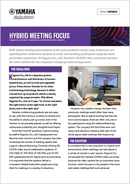O senzație consistentă este foarte importantă într-un mediu de lucru hibrid, în care întâlnirile pot avea loc într-o varietate de spații închise sau deschise. Kagome Co., Ltd a adoptat sistemul de sunet video Yamaha CS-800 deoarece camera video are o funcție de zoom automată, care se concentrează asupra persoanelor din sală și face întâlnirile să fie mai personale.