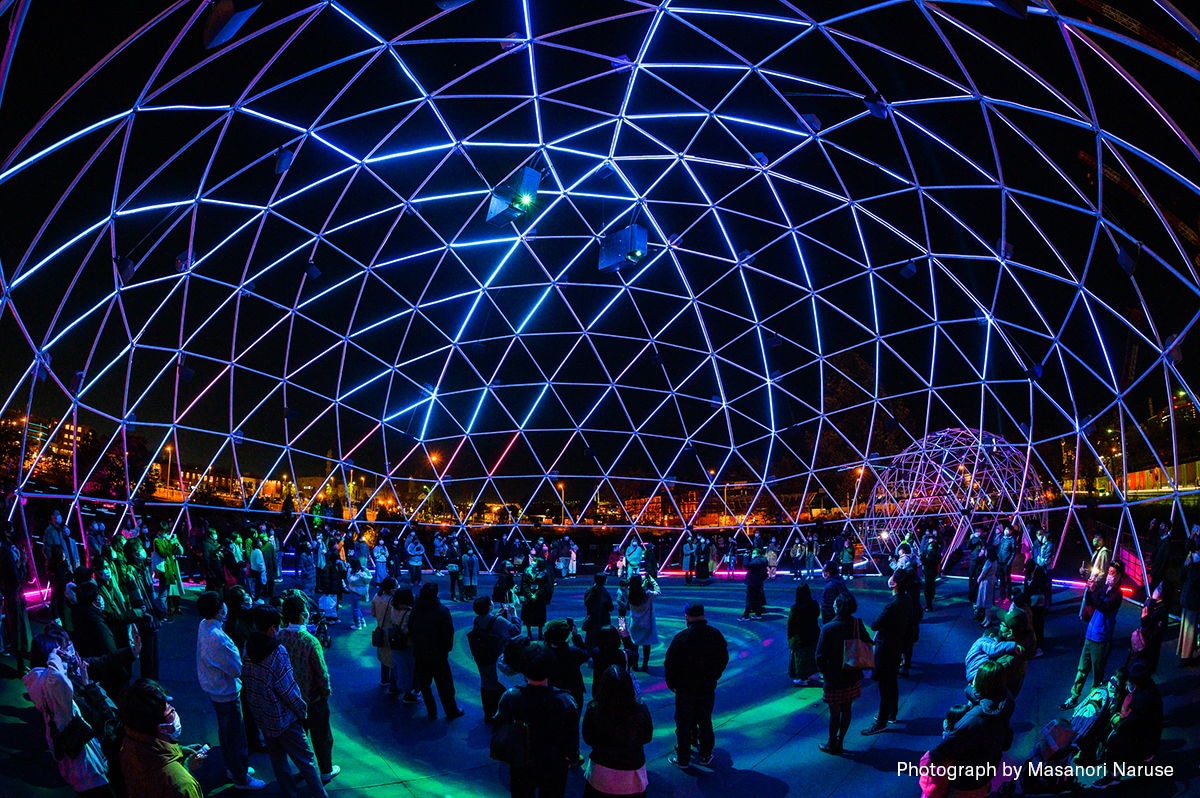 Yorunoyo is an urban illumination event spread across the entire Yokohama Bay Area for the public to experience the ever-growing “Yokohama-ness” through light and music. Yorunoyo consists of various interactive events: “NIGHT WALKING,” in which visitors experience light and sound in the “Cross Dome” at the Shinko Chuo Square, the main venue; “NIGHT VIEWING,” a five-minute event in which light and sound are interlinked with the surrounding facilities such as Minatomirai, Bashamichi, and Kannai; “PORTAL” installed at 12 locations in the waterfront area of central Yokohama, in which lights and sounds change as people pass; and an “ART CRUISE,” a night boat cruise where visitors can enjoy the illumination and projection mapping of Yorunoyo from the boat.