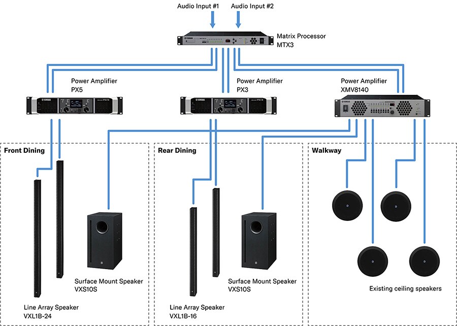 Finally, the restaurant wanted to use previously-installed speakers in the hallway, so needed amplifiers with enough power and channels to drive both the new and existing speakers.