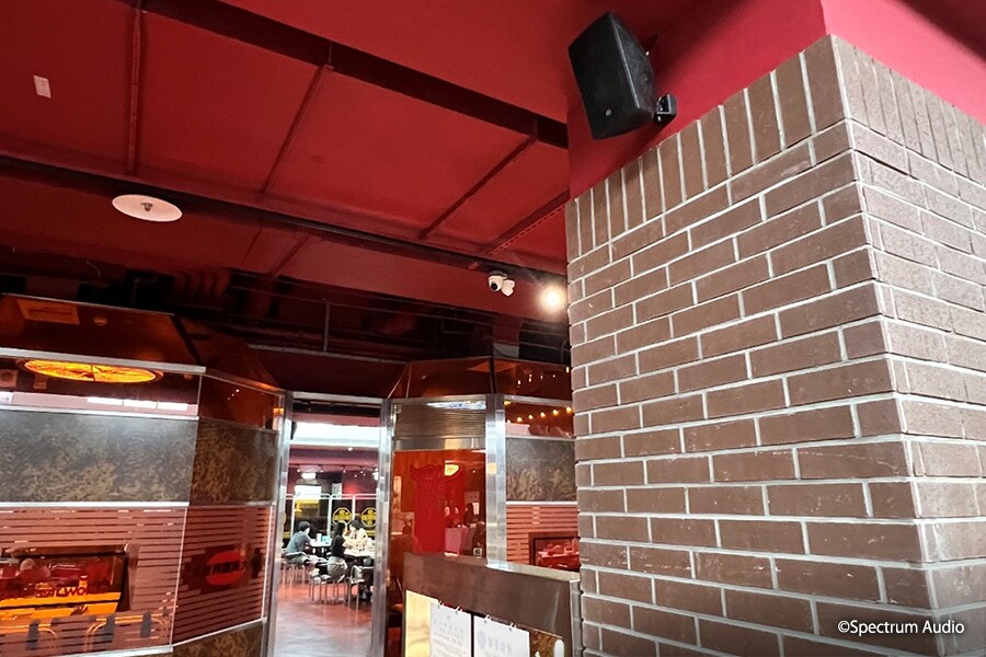 “This presented several challenges. Ambient noise levels of customer conversations and staff activity were projected to exceed 70dB, while there is no suspended ceiling in the dining area, which made using ceiling speakers impossible. Meanwhile, the BGM would need to be audible and clear, without overpowering customers’ conversations or negatively affecting their dining experience.”