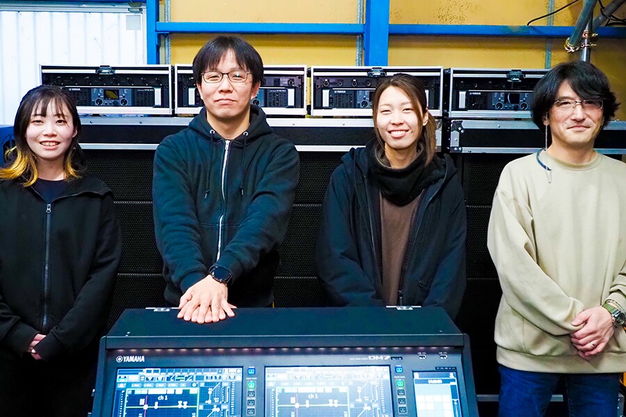 The FREEK Inc team with the Yamaha CHR series monitors and Yamaha DM7 digital mixing console. L-R: Ms. Rii Tanigaki, Mr. Hiroyuki Komori, Ms. Yuko Ohta, Mr. Hisashi Matsumura.