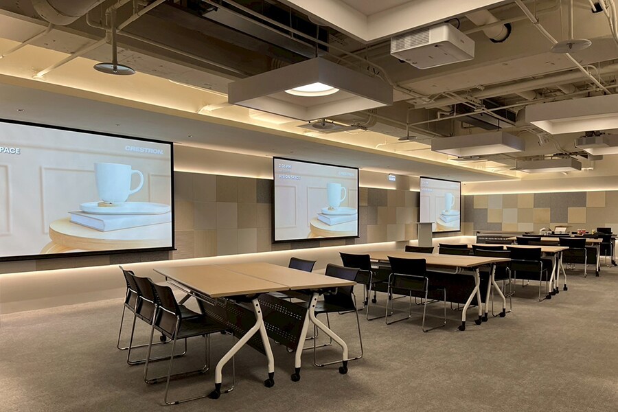 This area is designed as a discussion and meeting space. It features Yamaha ADECIA RM-CG ceiling-mounted array microphones, for a hands-free remote conferencing audio system, paired with Lumens PTZ cameras. The system is integrated to deliver automatic switching and tracking of the speaking participant.