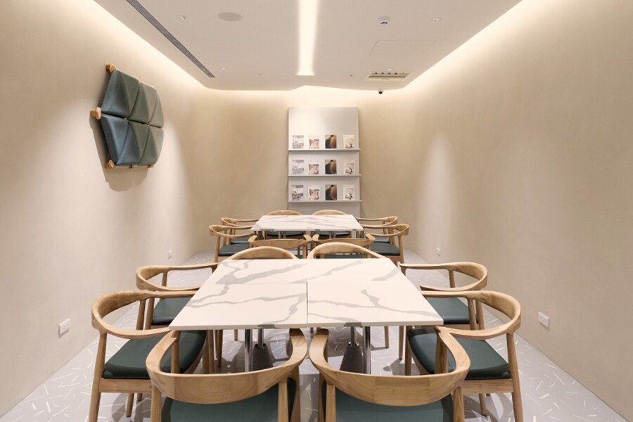 This area is designated for receptions and meetings, featuring a multi-functional island, private booths and professional banquet equipment. It also offers remote video conferencing capabilities, utilizing Yamaha ceiling-mounted speakers as the primary audio playback system.