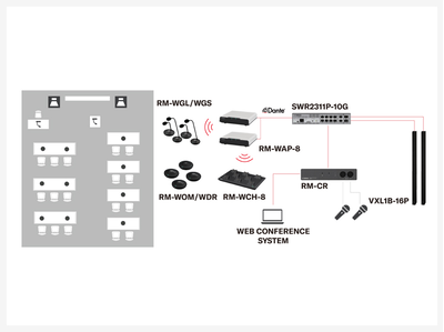 Its RM-CR conference processor offers two additional analogue microphone inputs. VXL1-16P speakers provide perfect audio output.