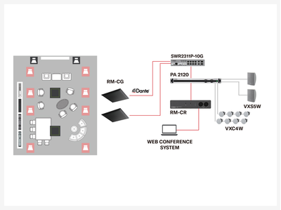 VXL1-16P Dante Speakers deliver clear sound reproduction. The system easily integrates with UC platforms. The RM-CR conference processor takes care of all the audio routing automatically.