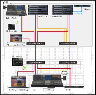 The standard Dante network uses a gigabit network switch in a star configuration. Network connections can be doubled for redundant operation so that the system remains operational even if a fault occurs in a network cable or device. If live recording is a requirement it’s easy to add Dante Virtual Soundcard and Steinberg Nuendo Live running on multiple computers. And if R series I/O racks are used with CL series consoles the Gain Compensation function makes it possible for multiple CL consoles to share Rio racks.
