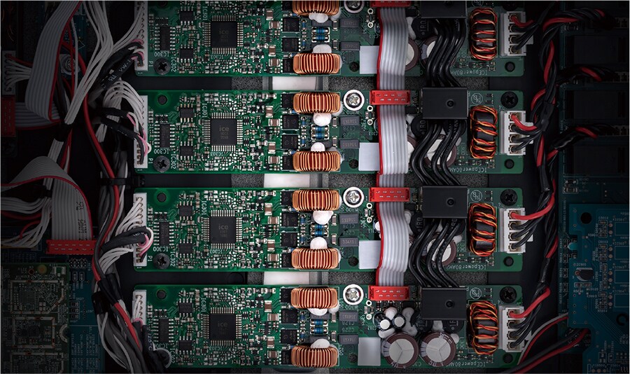 • Eight channels of audiophile-grade Class D amplification assignable to any zone, bridgeable and 4-ohm capable, featuring a unique ground loop/hum-free circuit design