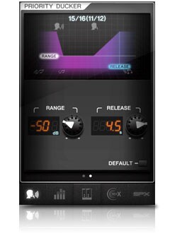 While the Priority Ducker's “Range” parameter settings for Hybrid Channel 1 and 2 can be controlled manually from the MGP console itself, MGP Editor provides additional flexibility, offering intuitive control of “Range” parameters as well as “Release” parameter settings for each Hybrid Channel. [RANEGE] controls Priority Ducker's level attenuator, and [RELEASE] adjusts release time. Both parameters can be controlled using MGP Editor's interface via the graphic display or two knobs underneath.