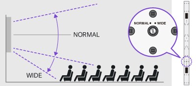 Vertical coverage can be adjusted via a rear-panel switch. Setting the switch to “Wide” expands the dispersion angle in the downward direction only, improving coverage at the front of the listening area in situations where the speakers are installed at a high location.