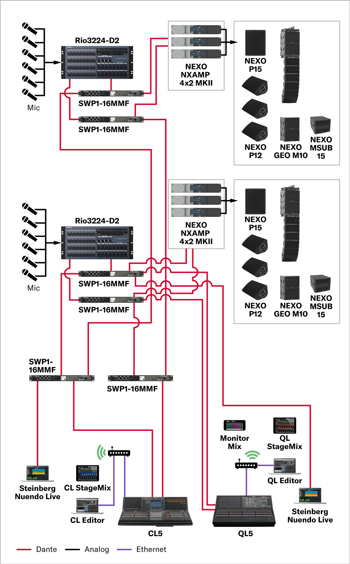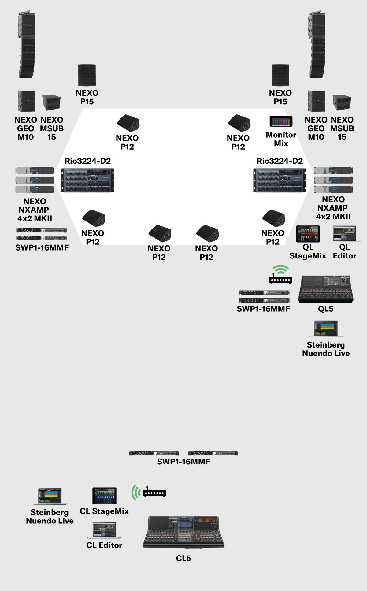 • Featuring the industry standard Dante audio network, this system allows hundreds of channels to be routed over a single Ethernet cable, making system set up and configuration significantly easier, while also supporting redundant connections to ensure reliability. The CL/QL series digital mixers are mainstays in the industry, renowned for their sound quality, powerful functionality, and flexibility, making them suitable even for larger events despite their diminutive size. Combined with compact, high-output NEXO GEO M12 loudspeakers, this system can reliably deliver high performance concert sound, requiring only a small number of people to operate, set up, and transport to the next venue.