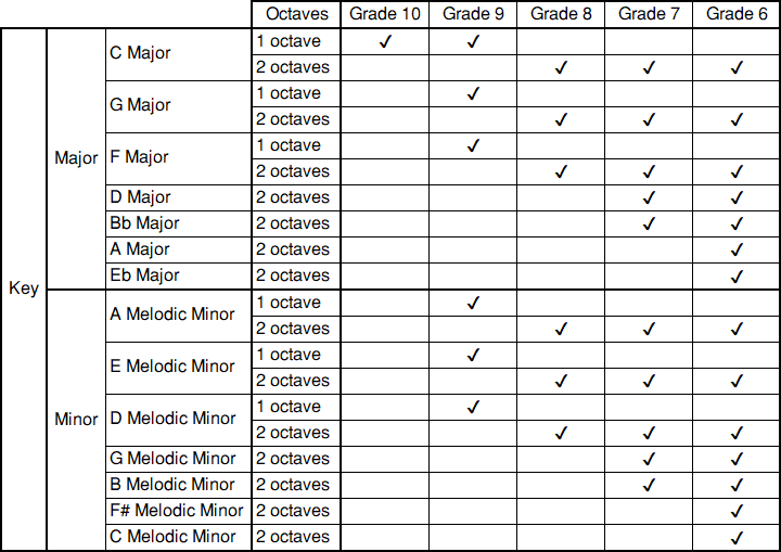 Candidates play one (Grade 10), two (Grades 9 - 6) scale(s) selected by the examiners without the use of a score.