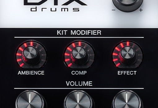The KIT MODIFIERs condense the sound creation know-how that Yamaha has accumulated over decades into three knobs: AMBIENCE, COMPRESSION, and EFFECT. A wide range of tonal possibilities are available thanks to Yamaha engineers — from the natural sound of acoustic drums, through to live performance sounds, to heavily effected sounds.