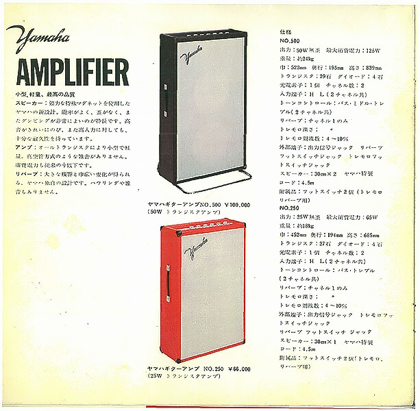 New models of Yamaha’s first guitar amps, No. 250 (TA25) and No. 500 (TA50). These combo amps were distinguishable by their speaker enclosures.