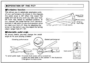 In addition to standard operation, the FC7 expression pedal also supports two unique Yamaha functions. The first is referred to as “fortissimo," and using this function, the pedal can be automatically returned to the standard position—a position set with a spring that can be adjusted up to a maximum of 10° using a screw in the base. The pedal can be set to any point between the fully raised position and the standard position shown in the diagram, and it will usually remain in this position until moved. If, however, the pedal is operated to within the spring return range, it will automatically return to the standard position when released. Using this extremely useful function, you can apply a basic volume or filter setting (corresponding to the standard position) for the majority of your performance, but where necessary, produce stronger (fortissimo) sounds for added expression. The other unique function makes it possible to change the tilt of the pedal, which is important because the angle of the foot differs depending on whether you are playing standing up or sitting down. In typical Yamaha fashion, this overall design takes much of the knowhow perfected for the Electone and reapplies it in a single pedal.
