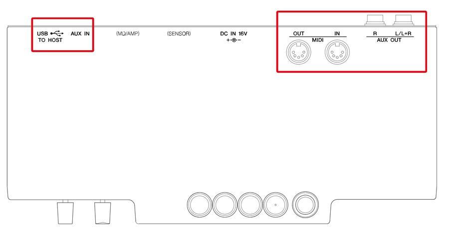 The USB TO HOST terminal allows you to connect to a computer or portable device and record high-quality audio without the need for an additional interface, while AUX OUT allows sound to be output to a variety of external devices (e.g. stereo components, IC recorders, speakers with built-in amplifiers, stereo systems), and AUX IN allows listening to sound from external devices (sound source modules and music players). MIDI OUTPUT transmits performance information to external devices such as synthesizers. MIDI IN allows the instrument to receive and playback performance information from sequencers using the tone generator of the SILENT Piano™ SH2 type.