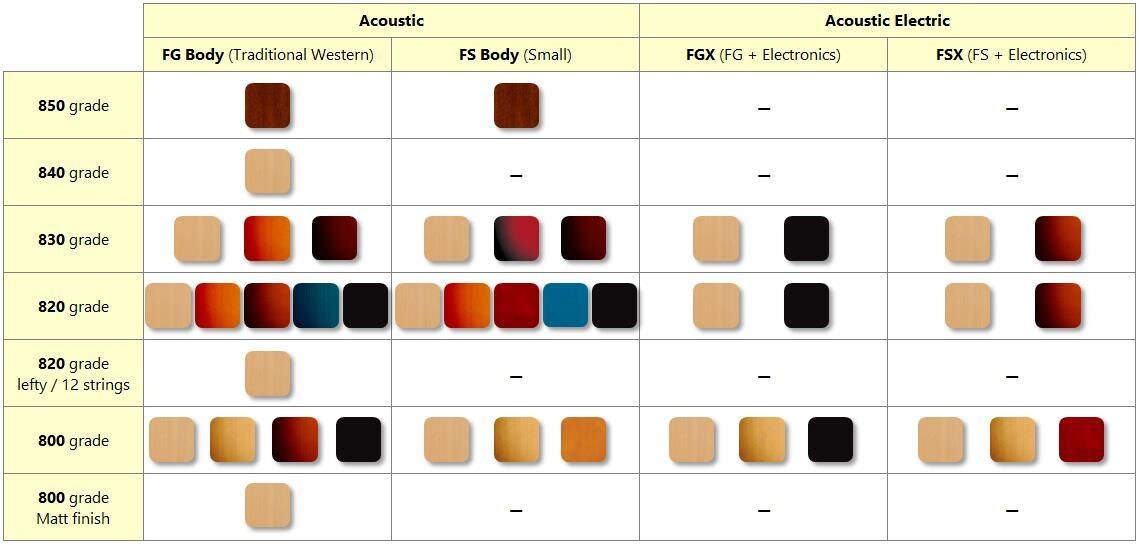 2 body shapes, including an all-new FS concert size; 5 grades featuring different tonewood options; a myriad of color options; acoustic or electric-acoustic models. Whatever the personality of your music, there’s an FG to match.