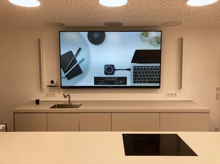 With the ADECIA ceiling microphone solution, speakers can be easily recorded in natural sound during meetings as well as during demonstrations in the kitchen, and also always remain clearly intelligible to the receiving party - regardless of where they are located. In addition, the line array speakers reproduce the speech of the remote side in best quality and volume. The ceiling microphone remains visually discreet. The white speakers, which are powered by PoE, blend in perfectly with the room environment. With the ceiling microphone, all participants in the room can be recorded, as it completely covers the meeting room and the show kitchen. ADECIA's automatic sound optimisation and convenient calibration procedure also made commissioning particularly easy. They enable an optimal sound even without structural changes, for example by additional sound elements. The easy set-up and calibration of the system makes it possible to make major changes to the room's décor and still get the best audio quality without being a sound expert.