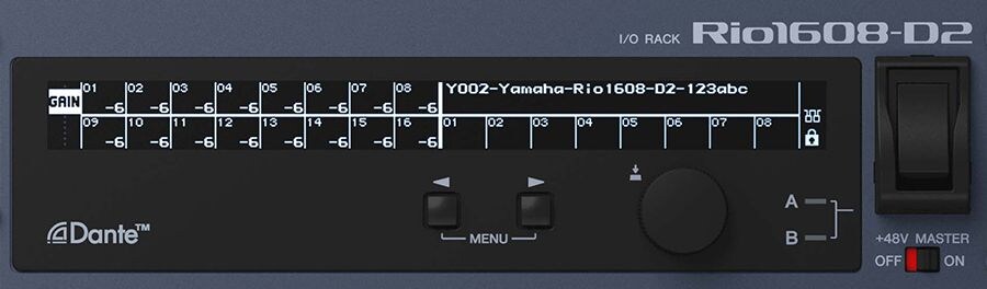 Another Rio3224-D2 and Rio1608-D2 refinement is the provision of character/icon displays rather than basic LED indicators, allowing quick, easy confirmation of Dante settings as well as metering, gain, high-pass filters, phantom power, and more. It is also possible to edit gain, high-pass filters, and phantom power settings directly from the I/O Rack interface, and even lock them if required. Remote operation from the R Remote software application is also possible.